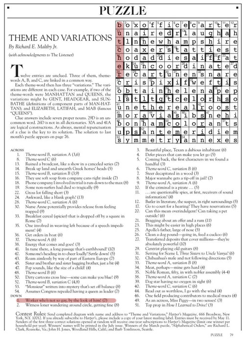 Oh, but how short a time ago (January 2010) that I first attempted a Harper's cryptic only to be thwarted by a theme built around Carol Channing. And now, a theme so deeply embedded in the bleeding hip heart of Now and Cool that I can only believe that Richard E. Maltby and cohort have heard the cries of TackyHarpersCrypticClues.blogspot.com and modernized accordingly. You're all welcome.